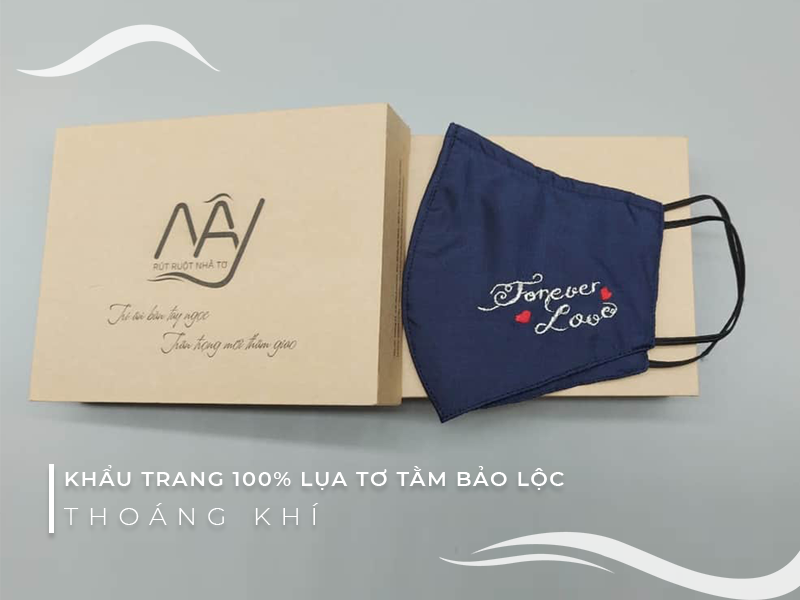 Khẩu trang thêu tay chữ Love của Quà Việt Nam được làm từ 100% Lụa tơ tằm cao cấp Bảo Lộc – Loại vải thượng hạng kháng khuẩn tự nhiên từ sợi tơ tằm.