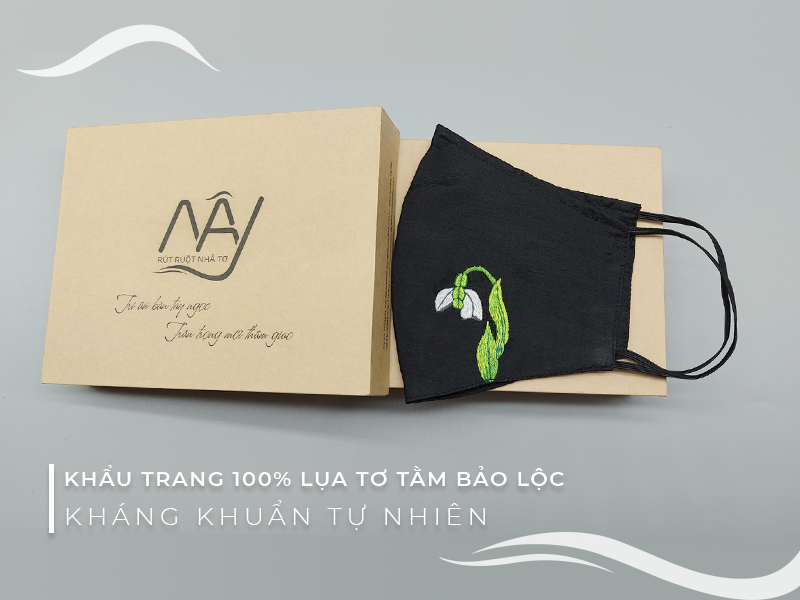 Khẩu trang thêu tay hoa xuyên tuyết của Quà Việt Nam được làm từ 100% Lụa tơ tằm cao cấp Bảo Lộc 3 lớp – Loại vải thượng hạng của Việt Nam, kháng khuẩn tự nhiên từ sợi tơ tằm.